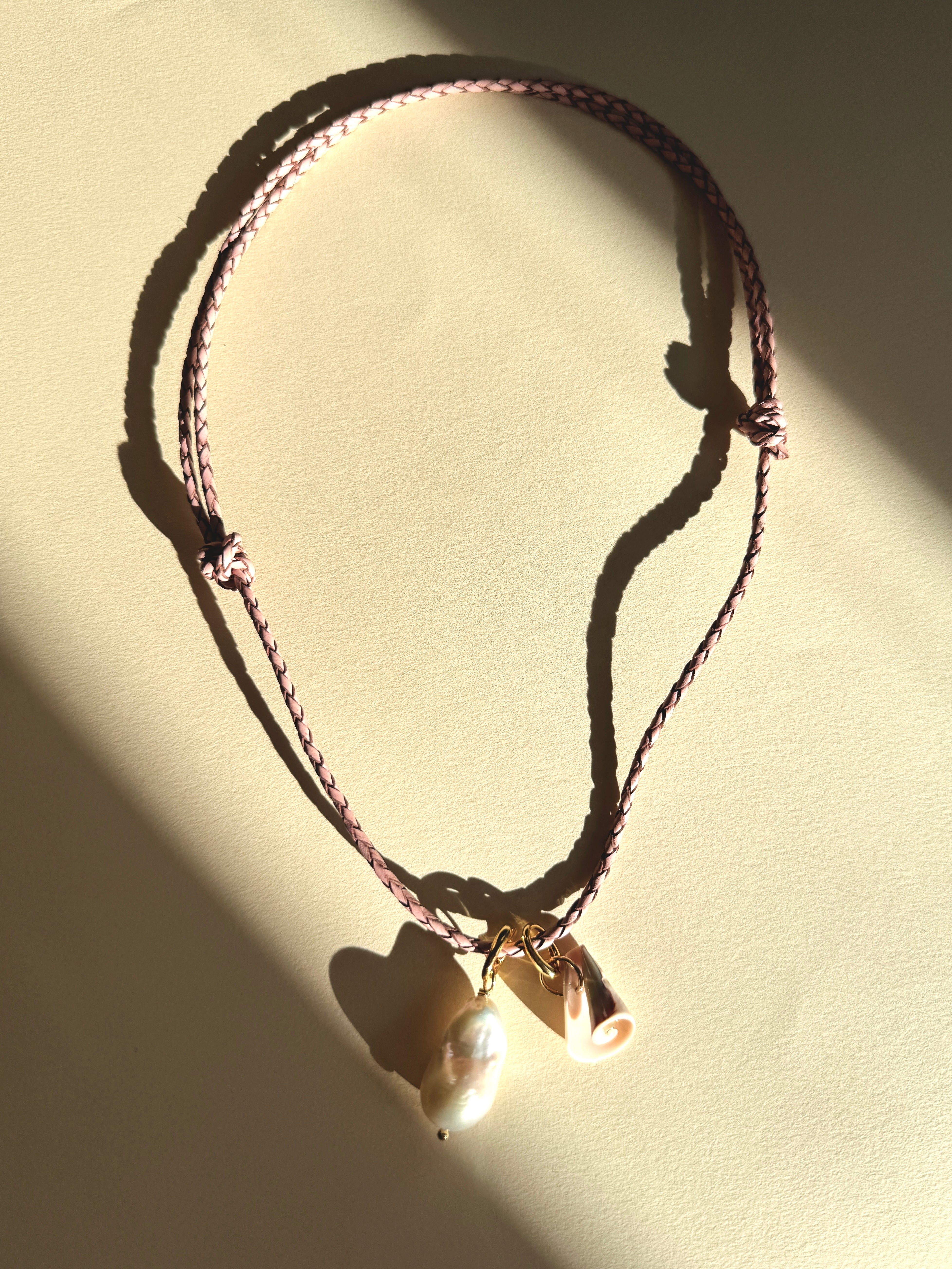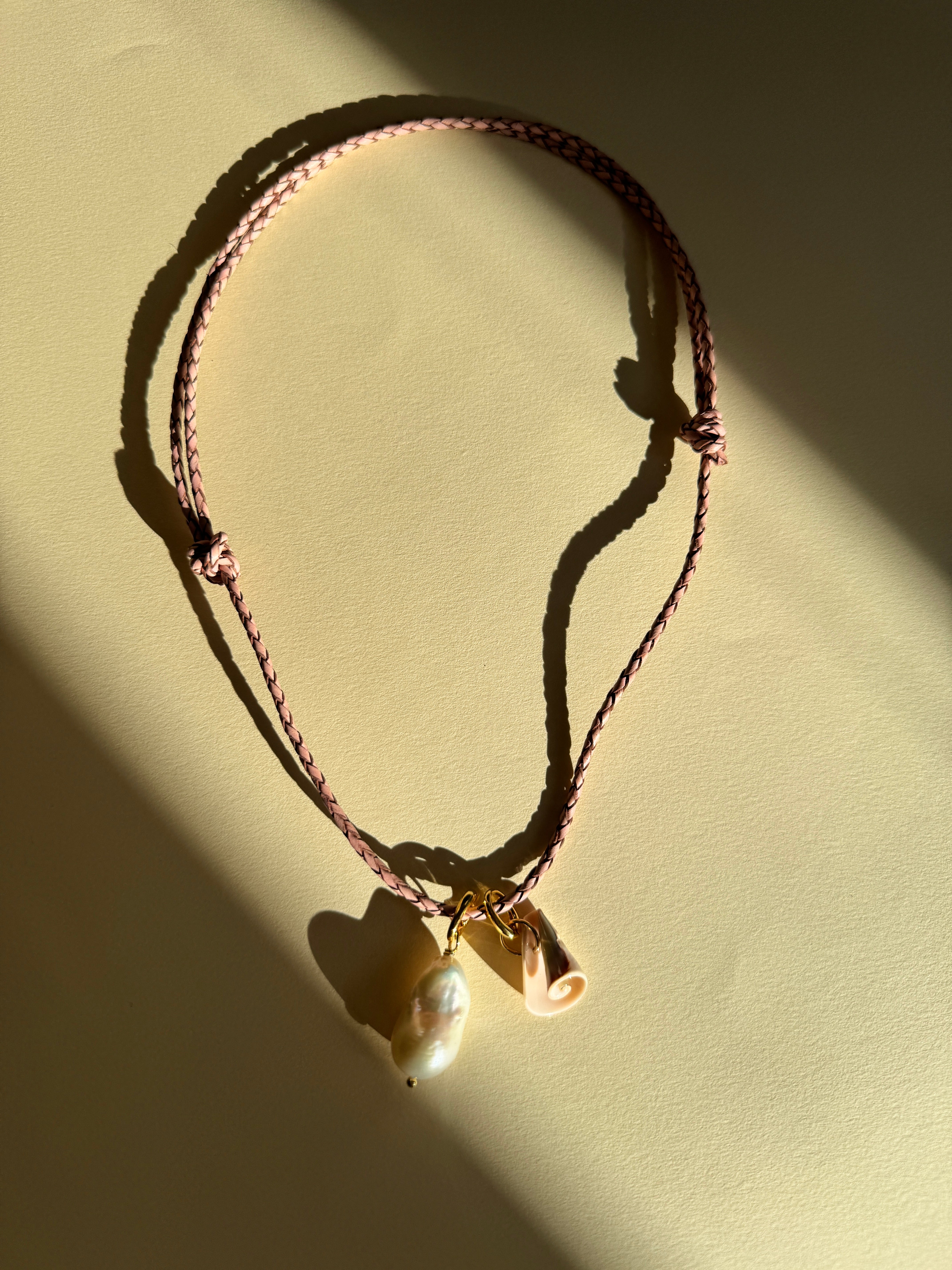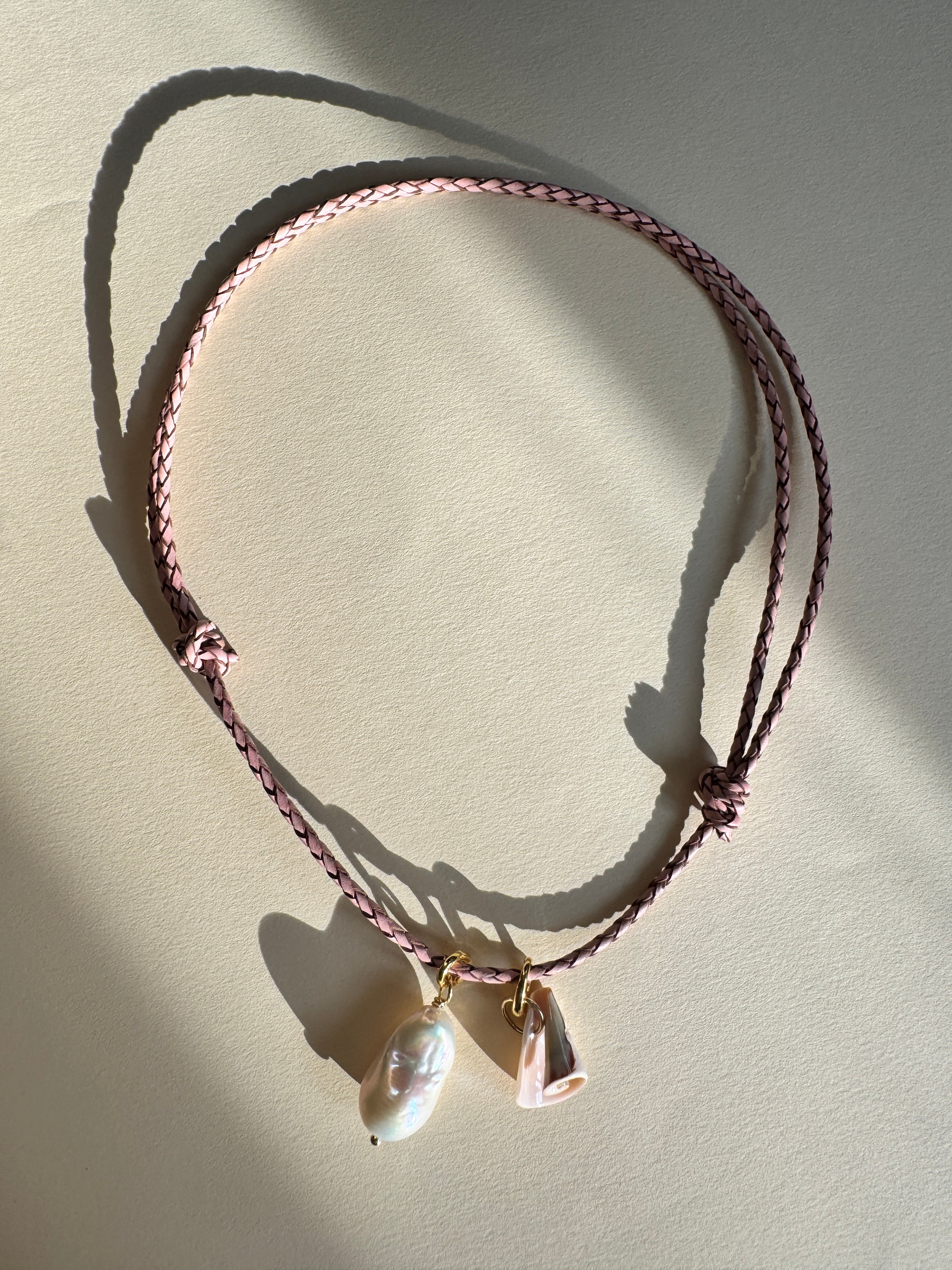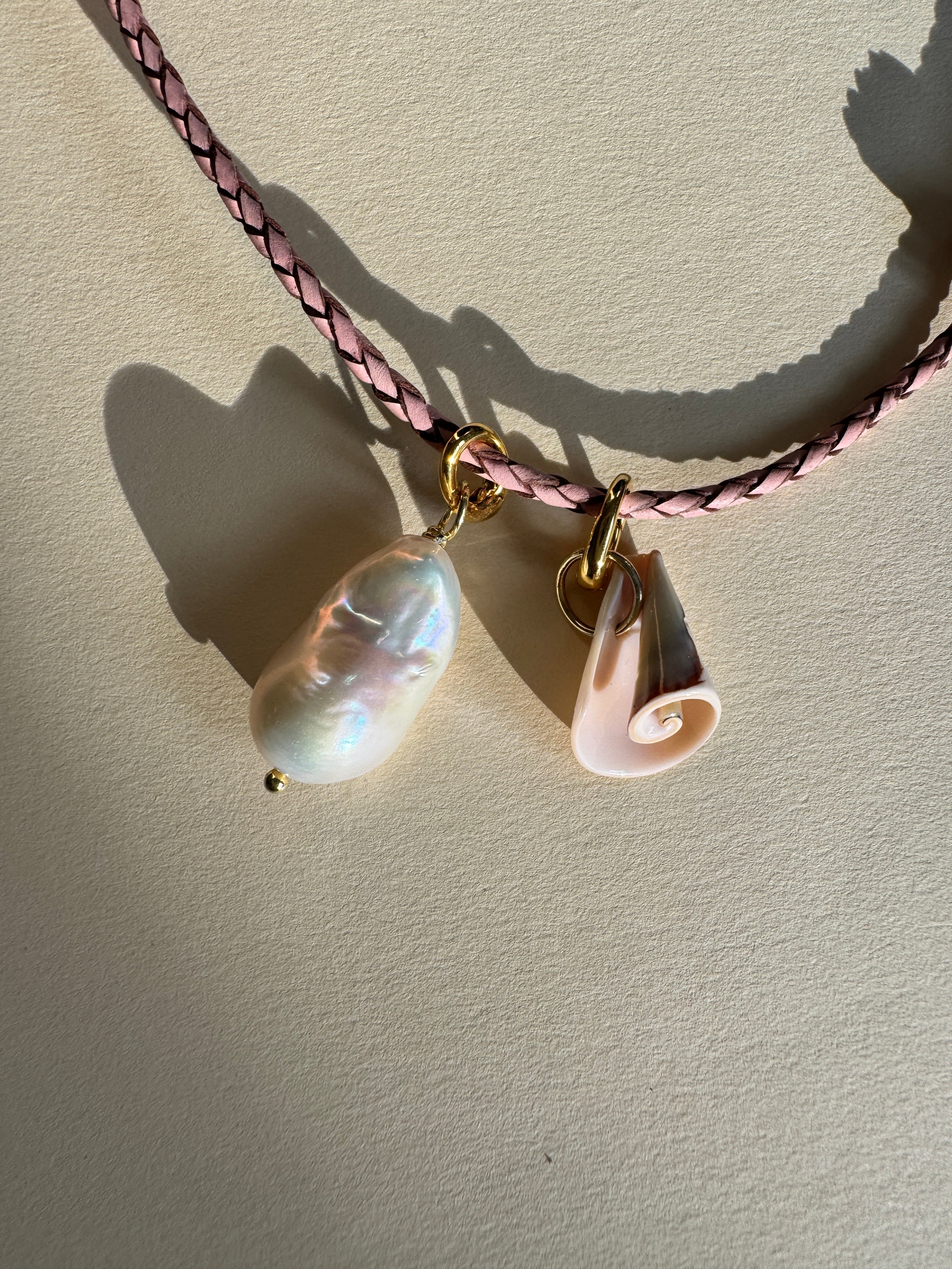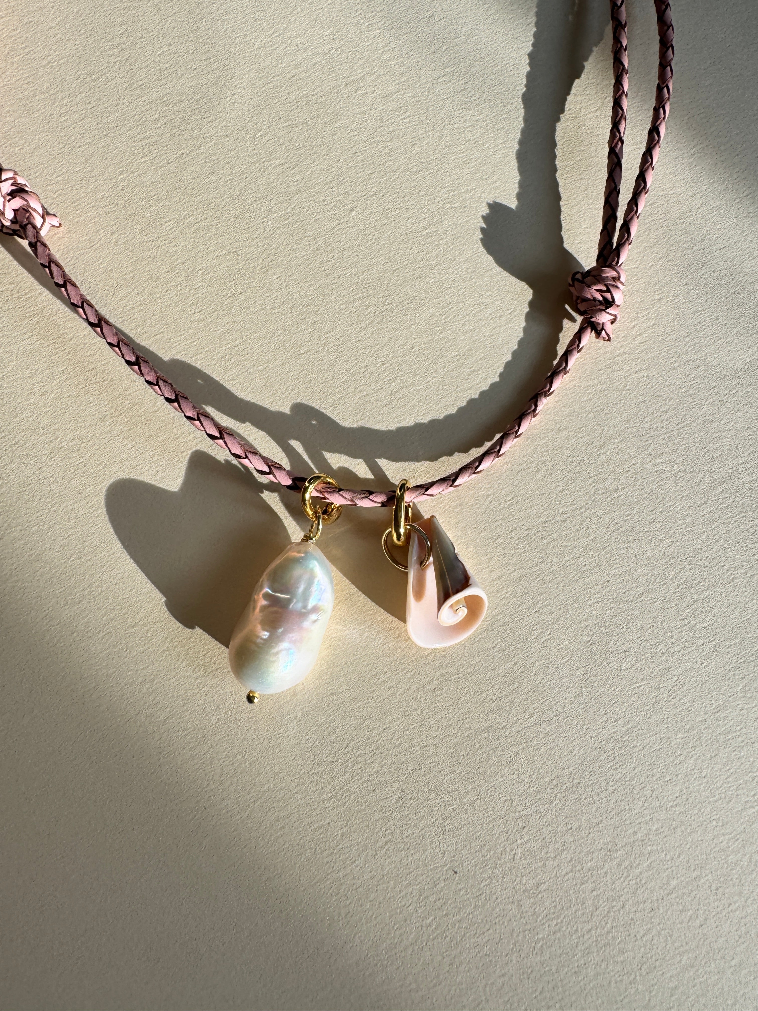 Unsere Amelie Kette besteht aus einem Lederband und kommt mit zwei Anhängern. Einer Baroque Perle und einer Muschel. Lässt sich in der Länge variieren